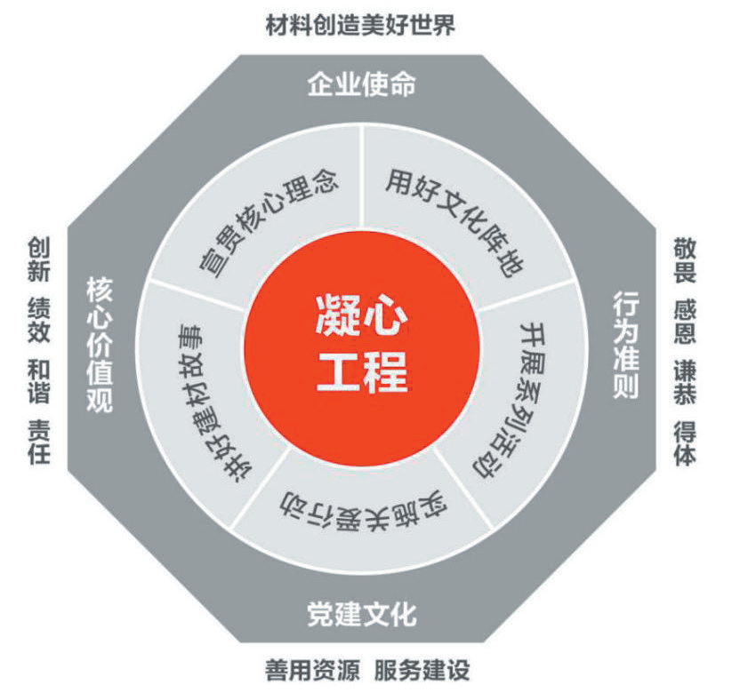 1.坚持企业的使命担当与党的初心使命紧密相连。始终胸怀“国之大者”,打造“国之大材”,坚持“善用资源、服务建设”的核心理念和“材料创造美好世界”的企业使命,不断突破新材料领域“卡脖子”关键核心技术,推动改革发展成果更好服务国家战略,更多惠及全体员工。